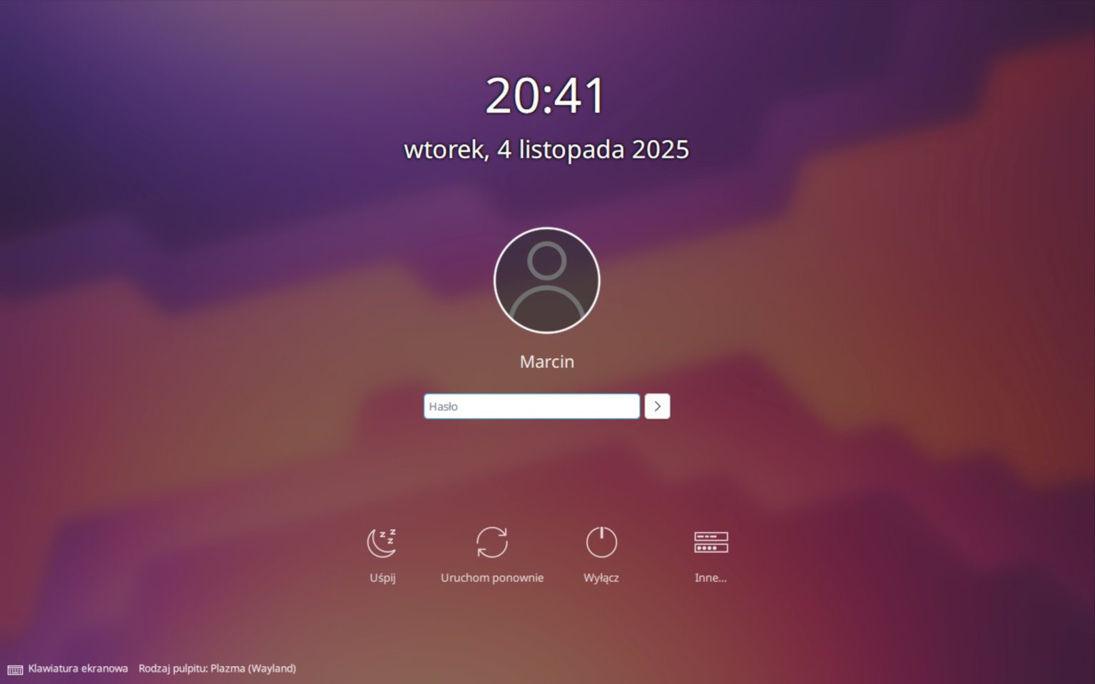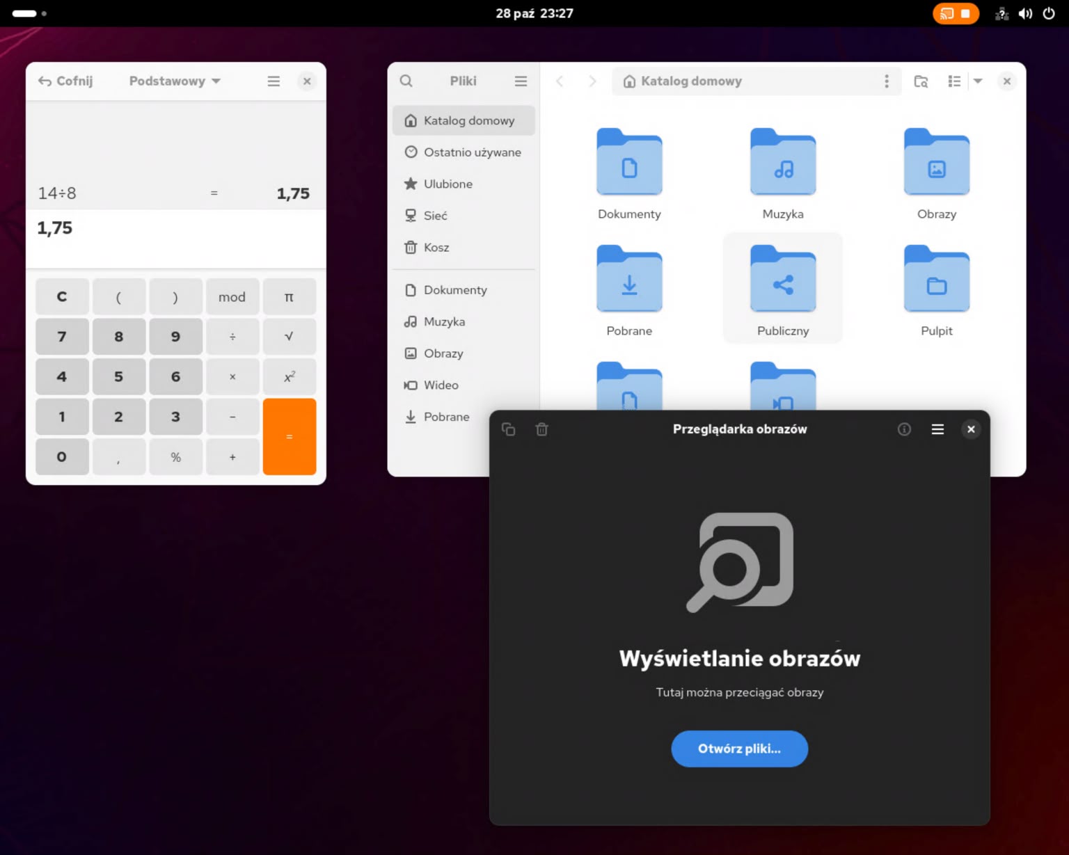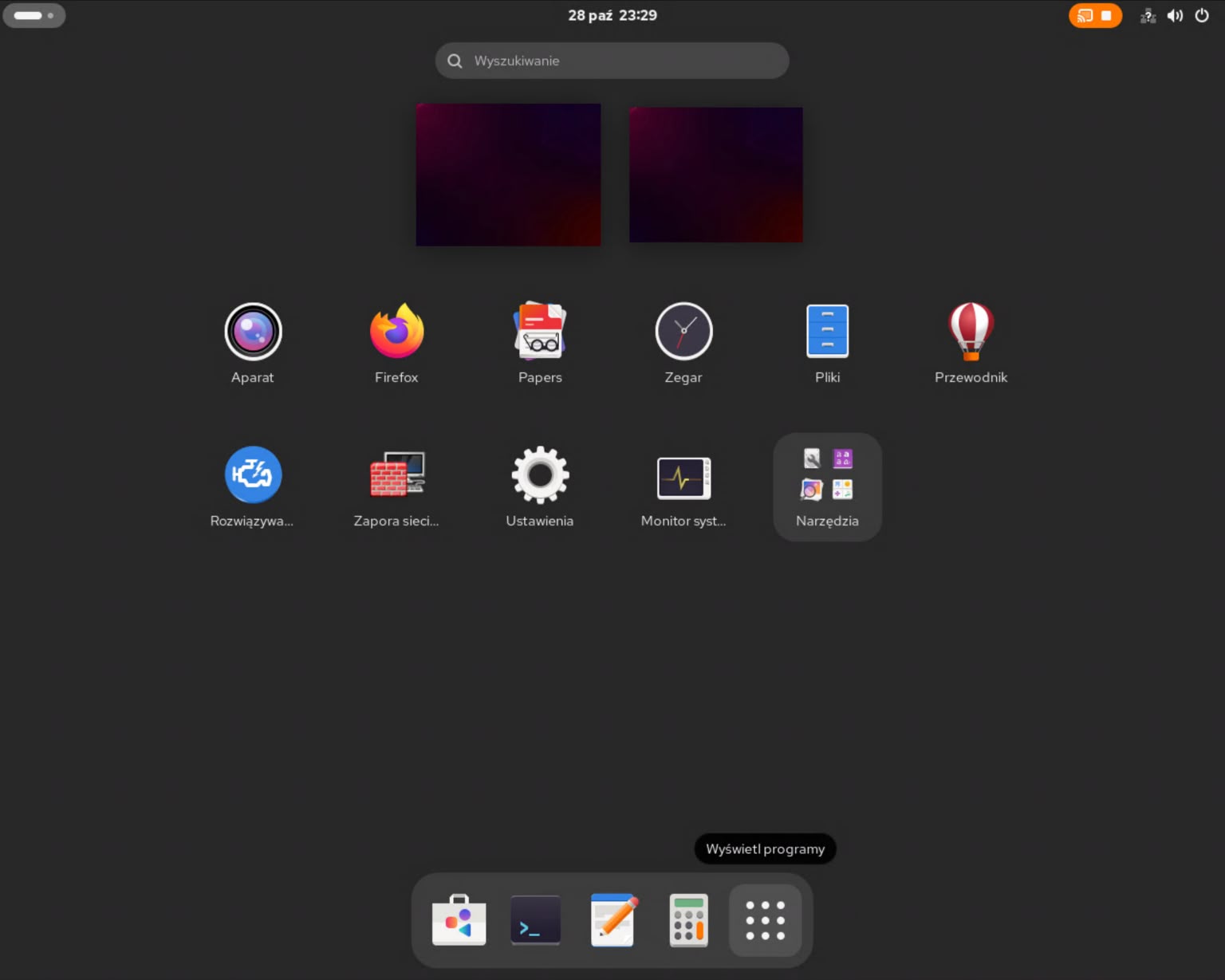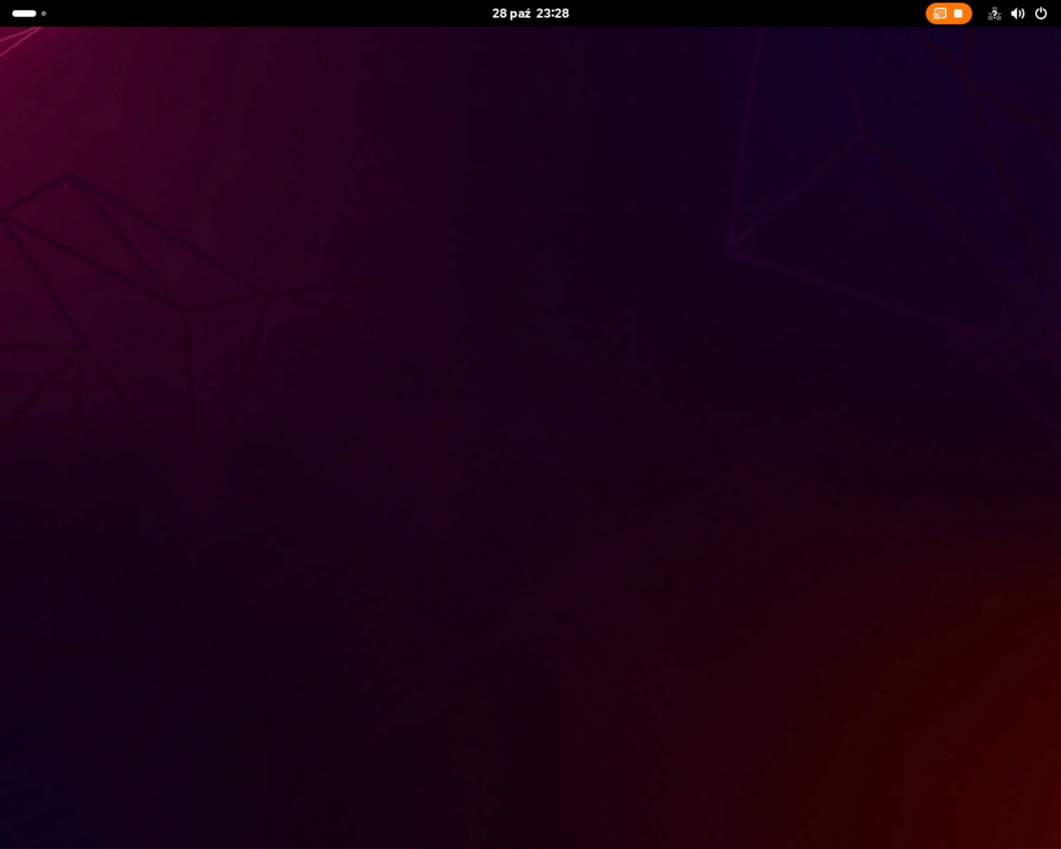 1 – Po restarcie powitał mnie ekran logowania, który po wpisaniu poprawnych danych wpuścił mnie do Gnome. I już w tym momencie coś zauważyłem. Nie było żadnych dźwięków. Ani powitania, ani żadnych innych. Sprawdziłem – jak sie okazało, system w ogóle nie widział urządzenia audio. Być może to dlatego, że monitor, z którego korzystam nie posiada własnych głośników, a jedynie wyjście mini-jack, do którego należy je podłączyć. No i te podłączone niestety nie grały.
